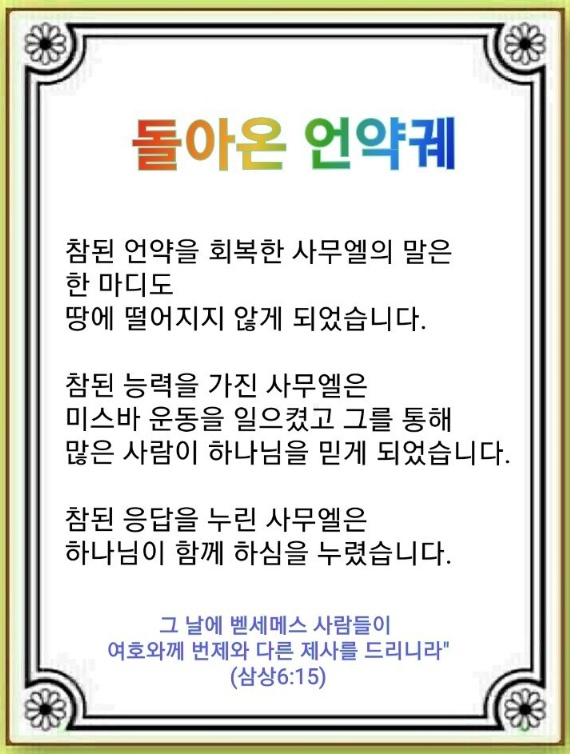 블레셋에 빼앗긴 언약궤가 돌아오자 이스라엘 백성은 기뻐했습니다. 이때 나타난 인물이 복음을 가진 사무엘이었습니다. 사무엘은 사울 왕과 다윗 왕을 세운 제사장이면서 정치 지도자였습니다. 사무엘이 키운 다윗은 블레셋의 손에서 이스라엘을 살렸고, 다윗의 아들 솔로몬은 성전을 지어 세계적 왕이 되었습니다. 아무런 배경이 없는 사무엘이 어떻게 하나님의 중요한 응답을 받을 수 있었을까요?