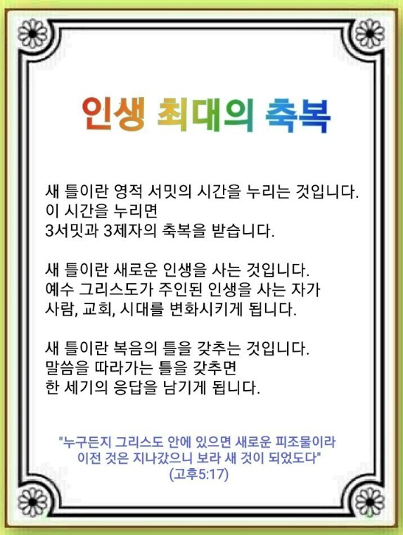 많은 사람이 “원래 나는 이런 사람”이라며 창세기 3장 원죄 속에서 태어난 모습 그대로 살아갑니다. 사탄이 만든 틀에 갇힌 것입니다. 우리는 예수 그리스도로 말미암아 옛 틀을 깨고 새 틀 속으로 들어가는 인생 최대의 축복을 받았습니다. 인생 최대의 축복인 새 틀이란 과연 무엇일까요?