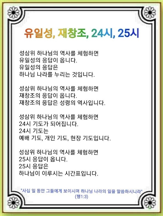 24시 기도할 때, 사람의 힘을 넘어선 25시의 응답이 옵니다. 이것은 사람의 수준을 넘어선 시간표이자 세상의 흐름을 바꾸는 시간표이며 그래서 영원한 시간표입니다.