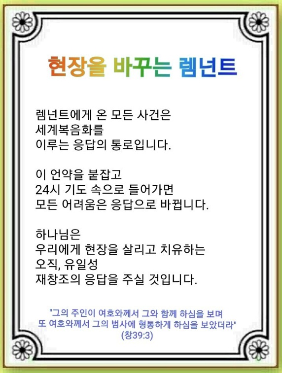 하나님은 우리에게 현장을 살리고 치유할 수 있는 오직, 유일성, 재창조의 응답을 주셨습니다. 이 응답을 가진 우리는 아무도 할 수 없는 것을 할 수 있습니다. 요셉이 아무도 갈 수 없는 현장인 보디발, 장관, 왕 앞에 선 것처럼 우리도 그곳에서 답을 주게 하십니다. 그리고 요셉을 그의 가족과 애굽, 나아가 세계를 구원하는 길로 인도하신 것처럼 우리를 아무도 갈 수 없는 길로 인도하십니다. 언약을 굳게 붙잡고 하늘 보좌를 움직이는 정시기도, 전 세계를 살리는 24시 기도 속으로 들어가면 됩니다. 하나님은 25시 비밀로 역사하실 것입니다.