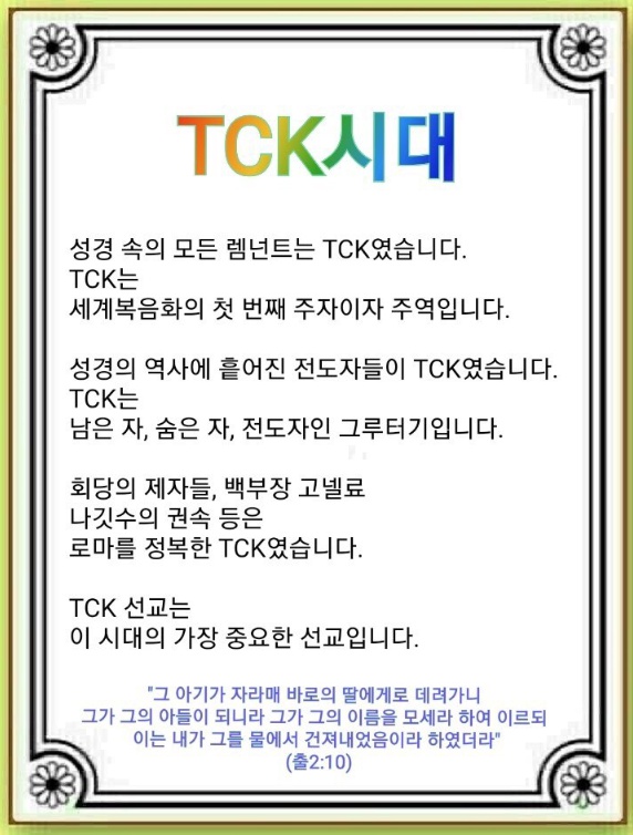 이스라엘은 시대마다 강대국에 속국이 되거나 전쟁으로 인해 고통을 겪었습니다. 그때마다 교회는 타락하거나 우상에 빠지기 일쑤였습니다. 이때 하나님은 한 번도 빠짐없이 Remnant를 세우셨습니다. 그리고 다민족운동에 Remnant를 사용하셨습니다. 이 일에 쓰임받은 자들이 TCK(Third Culture Kids, 제3 문화권 아이들)입니다. 하나님은 이 시대에도 TCK를 사용하십니다. TCK시대에 우리가 알아야 할 사실은 무엇일까요?