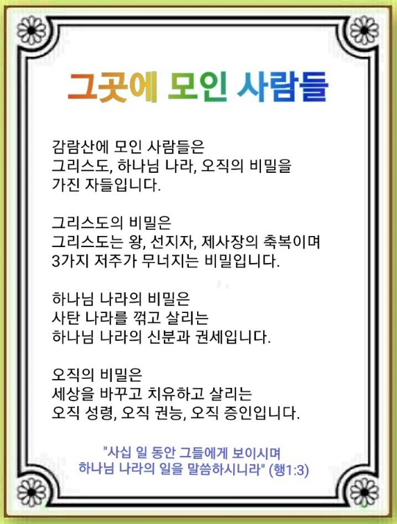 부활하신 예수님이 감람산에서 그리스도의 비밀을 확인시켜 주셨습니다. 예수가 그리스도라는 사실입니다. 그리스도는 왕, 선지자, 제사장의 축복이며 3가지 저주(재앙, 사탄, 지옥 배경)가 무너지는 비밀입니다. 그리고 성부, 성자, 성령 하나님의 비밀도 설명하셨습니다. 성부 하나님은 하나님 나라의 주인이시며, 성자 하나님은 그리스도이십니다. 성령 하나님은 능력으로 우리와 함께하십니다. 이 언약을 믿고 기다리면 예수 그리스도의 비밀에 증인이 됩니다.