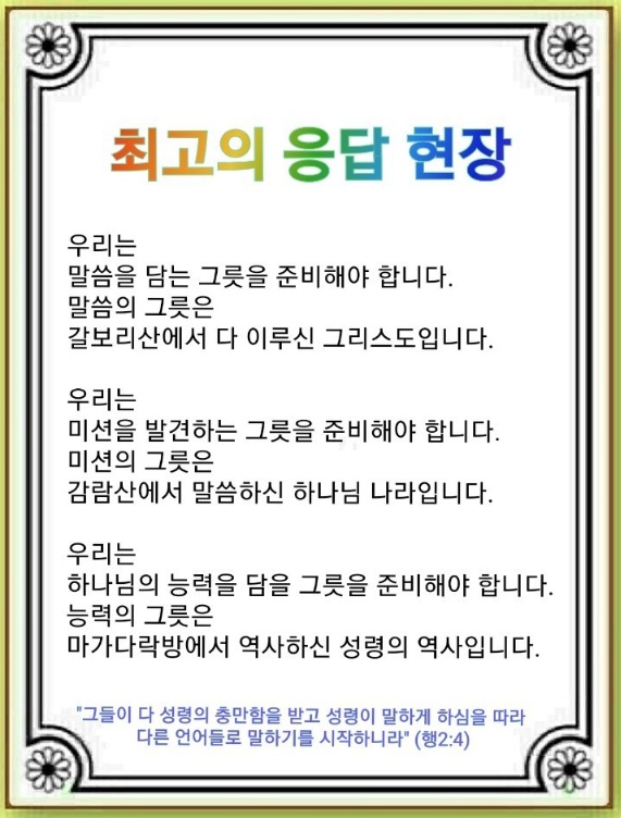 예수님이 하신 말씀을 담는 그릇을 준비해야 합니다. 갈보리산에서 돌아가시기 전, 예수님은 모든 민족에게 복음이 증거된 이후에 끝이 오리라고 말씀하셨습니다(마태복음 24:1~14). 그러므로 우리는 걱정할 필요가 없습니다. 그리고 세상에 가짜 신자와 빈 등만 들고 있는 사람이 많이 있겠지만 흔들리지 말라고 하셨습니다(마태복음 25:1~46). 이후 부활하신 예수님은 모든 민족에게 가라고 하셨고(마가복음 28:16~20), 그 누구도 줄 수 없는 성령 충만이라는 최고의 능력을 약속하셨습니다(사도행전 1:8).