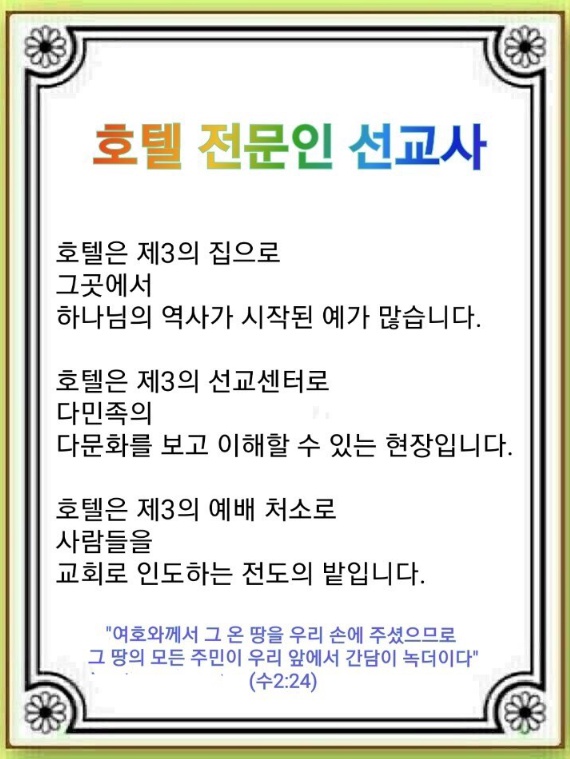 호텔은 제3의 선교센터입니다. 다민족이 머무는 곳이기 때문입니다. 계층도 아주 다양합니다. 그만큼 여러 가지 문화를 보고 이해할 수 있는 중요한 현장입니다.