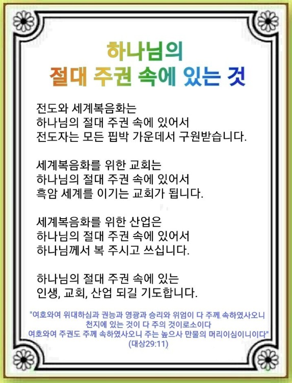 하나님은 우리를 치유하십니다. 이것을 체험할 필요가 있습니다. 40일 동안 아침에 말씀을 묵상하는 깊은 기도를 시작하면 됩니다. 무시기도는 생활 속에서 24시 기도하는 것입니다. 모든 것에 감사할 만큼 무시기도 속으로 들어가야 합니다. 밤에는 치유하는 집중기도 속으로 들어가면 증인으로 서게 됩니다. 핵심은 하나님의 절대 주권을 믿는 믿음 속에 있는 것입니다. 다윗이 하나님의 절대 주권 속에 있는 3가지를 고백했습니다. 과연 무엇일까요?