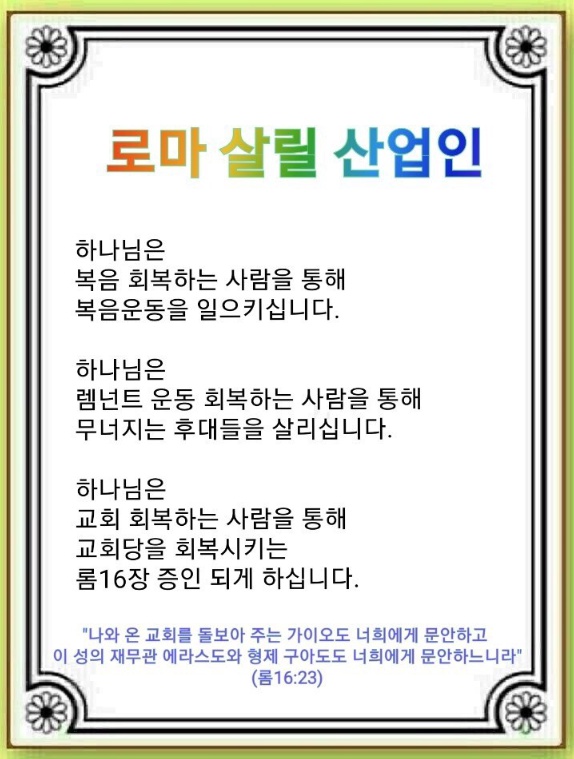 [전도자의 기도] 하나님! 나를 축복하셔서 흑암에 빠진 로마와 현장을 살리고 후대에 올바른 복음을 전달할 로마서 16장의 증인이 되게 하옵소서.