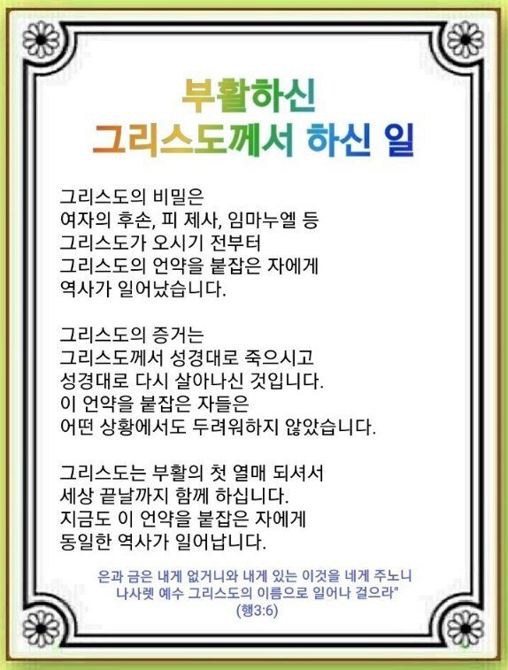 그리스도께서 예언대로 죽으시고 살아나셨습니다(고린도전서 15:3~5). 이 사건이 예수가 그리스도라는 증거입니다. 부활하신 그리스도는 가장 먼저 베드로를 찾아가 “내 양을 먹이라”라고 말씀하셨습니다. 엠마오로 가는 제자에게 성경에 기록된 그리스도에 관한 말씀을 주셨습니다. 그리고 열한 제자를 감람산으로 부르셔서 미래에 일어날 일과 성령 충만을 받아 증인이 될 것을 말씀하셨습니다. 이 언약을 붙잡은 제자들은 어떤 상황에서도 두려워하지 않았습니다.