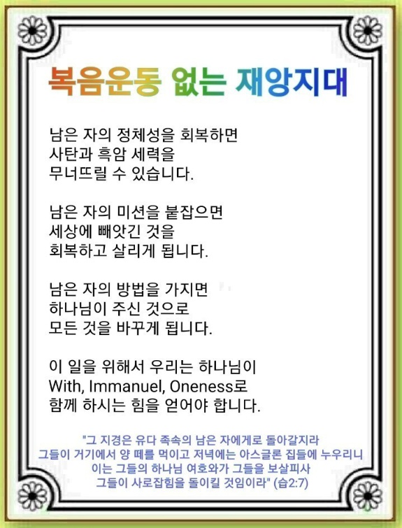 남은 자의 방법은 하나님이 주신 신분, 권세를 나의 것으로 붙잡고 모든 것을 바꾸는 것입니다(All Change). 이 일을 위해 우리는 하나님이 주시는 힘을 얻어야 합니다. 옛 틀을 벗고 나와 함께 하시고(WITH), 우리와 함께하시며(Immanuel), 모든 것이 합력하여 선을 이루시는(Oneness) 축복 속에 들어가는 것입니다. 이 영적 힘을 기른다면 하늘과 땅의 모든 권세가 축복으로 따라옵니다. 남은 자의 여정을 가는 우리에게 하나님은 모든 축복을 가지고 오십니다.