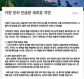 기도수첩 썸네일형 리스트형 서밋을 살리는 영적 대사(창세기 41:38)-기도수첩 #기도수첩 2022년 2월 1일 화요일 서밋을 살리는 영적 대사(창세기 41:38) 바로가 그의 신하들에게 이르되 이와 같이 하나님의 영에 감동된 사람을 우리가 어찌 찾을 수 있으리요 하고 ♬ 찬송가 502장 빛의 사자들이여(통일 259) [문서 보기] https://www.evernote.com/shard/s372/sh/03b16c2a-9783-ad50-1fb1-7a4a29e7dfd0/bbe8e67dad4d643b65dc64dd44606655 2021 세계 Remnant대회 3강 / 2021.8.4 2022년 2월 1일(화) 분류 2021- 제24차 세계렘넌트대회 제목 3강: Summit Healing by Remnant → Spiritual Ambassdor 성경 일시/장소 2021년 8월 3일-5일.. 더보기 영적 의사(창세기 3:15)-기도수첩 #기도수첩 2022년 1월 31일 월요일 영적 의사(창세기 3:15) 내가 너로 여자와 원수가 되게 하고 네 후손도 여자의 후손과 원수가 되게 하리니 여자의 후손은 네 머리를 상하게 할 것이요 너는 그의 발꿈치를 상하게 할 것이니라 하시고 ♬ 찬송가 362장 주여 복을 주시기를(통 481) [문서 보기] https://www.evernote.com/shard/s372/sh/a5794fa4-c960-5c56-9439-7c2b038be4af/aaac1015a7232c44c9c9ab830527e632 2021 세계 Remnant대회 2강 / 2021.8.4 2022년 1월 31일(월) 분류 2021- 제24차 세계렘넌트대회 제목 2강: Spiritual Doctor(영적 의사) → Those who know .. 더보기 서밋들의 리더(창세기 37:1~11)-기도수첩 #기도수첩 2022년 1월 29일 토요일 서밋들의 리더(창세기 37:1~11) 요셉은 노년에 얻은 아들이므로 이스라엘이 여러 아들들보다 그를 더 사랑하므로 그를 위하여 채색옷을 지었더니 그의 형들이 아버지가 형들보다 그를 더 사랑함을 보고 그를 미워하여 그에게 편안하게 말할 수 없었더라(3~4) ♬ 찬송가 84장 온 세상이 캄캄하여서(통일 96) [문서 보기] https://www.evernote.com/shard/s372/sh/8d037e57-5756-8b39-4399-90ea0776bc88/05875f25bdc6a37fa4a3571eaa73c1ee 2021 세계 Remnant대회 1강 / 2021.8.3 2022년 1월 29일(토) 분류 2021- 제24차 세계렘넌트대회 제목 1강: 237+렘넌트=L.. 더보기 지금 하지 않으면 안 되는 것(창세기 37:1~11)-기도수첩 #기도수첩 2022년 1월 28일 금요일 지금 하지 않으면 안 되는 것(창세기 37:1~11) 그의 형들은 시기하되 그의 아버지는 그 말을 간직해 두었더라(11) ♬ 찬송가 64장 기뻐하며 경배하세(통일 13) [문서 보기] https://www.evernote.com/shard/s372/sh/37c7e61a-4969-1d4d-8893-5280584716ea/f3ece67050c977fbc382c789c90b60a4 핵심훈련메시지 / 2021.7.31 2022년 1월 28일(금) 분류 핵심훈련 제목 제1,2,3 RUTC응답의 현장(29) - (OMC장학생 수련회 2강)- 지금 안하면 안되는 것 성경 창세기 37:1-10, 37:11 일시/장소 2021년 7월 31일, 예원교회 강사 류광수 목사 ( www.. 더보기 이전 1 ··· 81 82 83 84 85 86 87 ··· 489 다음