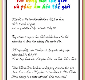 세계복음화 썸네일형 리스트형 세계 재앙과 세계복음화(로마서 16:17~20) 베트남어 기도수첩 18.01 Tai ương của thế giới và phúc âm hóa thế giới Rô ma 16:17-20 “Ðức Chúa Trời bình an sẽ kíp giày đạp quỉ Sa-tan dưới chơn anh em. Nguyền xin ân điển của Ðức Chúa Jêsus chúng ta ở cùng anh em” (20) Trong thời gian chúng ta cầu nguyện Đức Thánh Linh sẽ hành động. Vì vậy người của Đức Chúa Trời không có lý do để nản lòng (Giăng 14:16-17). Hơn nữa Đức Chúa Trời đã gửi thiên sứ chúng t.. 더보기 세계복음화(마태복음 28:16~20) 베트남어 기도수첩 12.01 Phúc âm hóa thế giới Ma thi ơ 28:16-20 “Ðức Chúa Jêsus đến gần, phán cùng môn đồ như vầy: Hết cả quyền phép ở trên trời và dưới đất đã giao cho ta. Vậy, hãy đi dạy dỗ muôn dân, hãy nhơn danh Ðức Cha, Ðức Con, và Ðức Thánh Linh mà làm phép báp tem cho họ, và dạy họ giữ hết cả mọi điều mà ta đã truyền cho các ngươi. Và nầy, ta thường ở cùng các ngươi luôn cho đến tận thế. “(18-20) .. 더보기 세계복음화를 위한 새로운 체질(20161102) 베트남어 기도수첩 02.11 Thể chất mới để phúc âm hóa thế giới Công vụ các sứ đồ 1:8 “Nhưng khi Ðức Thánh Linh giáng trên các ngươi, thì các ngươi sẽ nhận lấy quyền phép, và làm chứng về ta tại thành Giê-ru-sa-lem, cả xứ Giu-đê, xứ Sa-ma-ri, cho đến cùng trái đất.” Bây giờ là thời đại của cuộc chiến thuộc linh. 3 đoàn thể (new age, free mason, tổ chức người giu đa) đang sử dụng văn hóa và hủy diệt con ngư.. 더보기 세계복음화를 위한 새로운 뿌리(20161101) 베트남어 기도수첩 01.11 Cội rễ mới để phúc âm hóa thế giới Công vụ các sứ đồ 1:3 “Sau khi chịu đau đớn rồi, thì trước mặt các sứ đồ, Ngài lấy nhiều chứng cớ tỏ ra mình là sống, và hiện đến với các sứ đồ trong bốn mươi ngày, phán bảo những sự về nước Ðức Chúa Trời.” Cả thế giới này đang bị giày xé bởi những vấn đề thuộc linh không thể nào hiểu được. Và kẻ đứng đằng sau gieo rắc cội rễ văn hóa đen tối cho.. 더보기 이전 1 ··· 24 25 26 27 다음