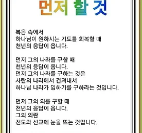 임마누엘 썸네일형 리스트형 인생 작품(매일성경:3:5) - 기도수첩 #기도수첩 2019년 3월 5일 화요일(매일성경) 인생 작품(빌립보서 1:6) 너희 안에서 착한 일을 시작하신 이가 그리스도 예수의 날까지 이루실 줄을 우리는 확신하노라 ♬ 정시예배를 위한 찬송 / 384장 나의 갈 길 다가도록(구 434장) [문서 보기] https://www.evernote.com/l/AXQft-cYyUVDJYr56EF2L6eIhaqXUQRF0qk/ [동영상 보기] https://youtu.be/qgDeyNrNf58 어느 누구도 자신의 인생을 허투루 살고 싶어 하지 않습니다. 모두가 성공한 인생을 살기를 원합니다. 자신의 생명과 인생보다 소중한 것은 없다고 생각하기 때문입니다. 그럼에도 실제로는 많은 사람이 두려움과 고통 속에 하루를 보냅니다. 인생의 시작점이 예수 그리스도에서 다시 .. 더보기 먼저 할 것(매일성경 3:4) - 기도수첩 #기도수첩 2019년 3월 4일 월요일(매일성경 3:4) 먼저 할 것(마태복음 6:31~33) 그러므로 염려하여 이르기를 무엇을 먹을까 무엇을 마실까 무엇을 입을까 하지 말라 이는 다 이방인들이 구하는 것이라 너희 하늘 아버지께서 이 모든 것이 너희에게 있어야 할 줄을 아시느니라 그런즉 너희는 먼저 그의 나라와 그의 의를 구하라 그리하면 이 모든 것을 너희에게 더하시리라 ♬ 정시예배를 위한 찬송 / 391장 오 놀라운 구세주(구 446장) [문서 보기] https://www.evernote.com/l/AXTm3s6IdMVHtp4S-b9yn70Rj0Olk9weiug/ [동영상 보기] https://youtu.be/n3bRG8Ekh4s 모든 피조물 중 영적 존재인 사람만 구원받을 수 있습니다. 영적 세계를 .. 더보기 237개 나라를 살릴 공무원(매일성경 3:2) - 기도수첩 #기도수첩 2019년 3월 2일 토요일(매일성경 3:2) 237개 나라를 살릴 공무원(사도행전 8:26~40) 주의 사자가 빌립에게 말하여 이르되 일어나서 남쪽으로 향하여 예루살렘에서 가사로 내려가는 길까지 가라 하니 그 길은 광야라 일어나 가서 보니 에디오피아 사람 곧 에디오피아 여왕 간다게의 모든 국고를 맡은 관리인 내시가 예배하러 예루살렘에 왔다가 돌아가는데 수레를 타고 선지자 이사야의 글을 읽더라(26~28) ♬ 정시예배를 위한 찬송 / 515장 눈을 들어 하늘 보라(구 256장) [문서 보기] https://www.evernote.com/l/AXTvpcrt3btLNIKzB5kDagHDDIWeX55Zaa8/ [동영상 보기] https://youtu.be/KlI3UW03I9I 하나님이 보시기에 23.. 더보기 나라 사랑(매일성경 3:1) - 기도수첩 #기도수첩 2019년 3월 1일 금요일(매일성경 3:1) 나라 사랑(열왕기상 18:1~13) 아합이 왕궁 맡은 자 오바댜를 불렀으니 이 오바댜는 여호와를 지극히 경외하는 자라 이세벨이 여호와의 선지자들을 멸할 때에 오바댜가 선지자 백 명을 가지고 오십 명씩 굴에 숨기고 떡과 물을 먹였더라(3~4) ♬ 정시예배를 위한 찬송 / 354장 주를 앙모하는 자(구 394장) [문서 보기] https://www.evernote.com/l/AXRlsxTFeUJGvbpLy4Fz7sbnSs3X2h_wHe8/ [동영상 보기] https://youtu.be/uULxE4WRrNM 공무원 현장이 어렵다는 생각이 들 수 있습니다. 공무원은 세상에서 성공한 것처럼 보이지만, 사탄이 서밋된 현장에서 무릎 꿇기 쉽습니다. 그래서 하나.. 더보기 이전 1 ··· 217 218 219 220 221 222 223 ··· 329 다음