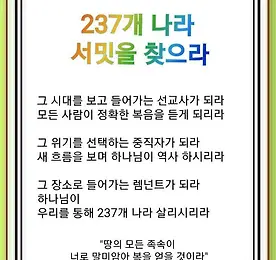 임마누엘 썸네일형 리스트형 기도수첩(25시 서밋 선교사(행 1:8)- 조은친구 #기도수첩 2018년 8월 7일 화요일 25시 서밋 선교사(행 1:8) 오직 성령이 너희에게 임하시면 너희가 권능을 받고 예루살렘과 온 유대와 사마리아와 땅 끝까지 이르러 내 증인이 되리라 하시니라 ♬ 정시예배를 위한 찬송 / 502장 빛의 사자들이여(구 259장) [문서 보기] http://www.evernote.com/l/AXROfZUefWZPp6YVQxgDbvYsH44C_HdFQVg/ [동영상 보기] https://youtu.be/7FSbZBIiGYM 25시란 하나님 능력의 시간표입니다. 영세 전에 감추어졌다가 지금 나타나 세세무궁하도록 있을 것입니다(로마서 16:25~27). 그리고 예수님이 설명하신 하나님 나라(사도행전 1:3), 즉 임마누엘입니다. 이것을 24시 누리며 기다린다면, 우리와 함께.. 더보기 25시 치유 선교사(행 1:8) - 조은친구 #기도수첩 2018년 8월 6일 월요일 25시 치유 선교사(행 1:8) 오직 성령이 너희에게 임하시면 너희가 권능을 받고 예루살렘과 온 유대와 사마리아와 땅 끝까지 이르러 내 증인이 되리라 하시니라 ♬ 정시예배를 위한 찬송 / 93장 예수는 나의 힘이요(구 93장) [문서 보기] http://www.evernote.com/l/AXTGI4CT8QlLMYaSzM0RY2SB7bFVagb8O0E/ [동영상 보기] https://youtu.be/7FSbZBIiGYM 24시 집중해서 하나님을 향하는 시간을 가지면 치유가 일어납니다. 이것이 25시 되어지는 것이 서밋입니다. 우리는 25시의 비밀을 아는 치유 선교사입니다. 사탄은 통치자들과 권세들과 이 어둠의 세상 주관자들과 하늘에 있는 악의 영들을 완전히 장악했습니.. 더보기 237개 나라 서밋을 찾으라(창 12:1~3) - 조은친구 #기도수첩 2018년 8월 4일 토요일 237개 나라 서밋을 찾으라(창 12:1~3) 여호와께서 아브람에게 이르시되 너는 너의 고향과 친척과 아버지의 집을 떠나 내가 네게 보여 줄 땅으로 가라 내가 너로 큰 민족을 이루고 네게 복을 주어 네 이름을 창대하게 하리니 너는 복이 될지라 너를 축복하는 자에게는 내가 복을 내리고 너를 저주하는 자에게는 내가 저주하리니 땅의 모든 족속이 너로 말미암아 복을 얻을 것이라 하신지라 ♬ 정시예배를 위한 찬송 / 501장 너 시온아 이 소식 전파하라(구 255장) [문서 보기] http://www.evernote.com/l/AXRBZGSEqM9B-YpiCU5r6NEmFi_XLpYeiAU/ [동영상 보기] https://youtu.be/qg3RTfqjVs4 하나님이 가장 .. 더보기 237개 나라를 치유하라(마 24:1~14) - 조은친구 #기도수첩 2018년 8월 3일 금요일 237개 나라를 치유하라(마 24:1~14) 이 천국 복음이 모든 민족에게 증언되기 위하여 온 세상에 전파되리니 그제야 끝이 오리라(14) ♬ 정시예배를 위한 찬송 / 510장 하나님의 진리등대(구 276장) [문서 보기] http://www.evernote.com/l/AXQj_Ox0FklDgK2JLQjU5K3qNPaHf6HkOWE/ [동영상 보기] https://youtu.be/LBLJrKIGeIk 우리는 237개 나라를 살리라는 사명을 받았지만, 능력도 없고 잘 안 된다며 오해하고 있습니다. 세상에는 크고 힘 있는 자가 많지만 그들이 세계복음화를 이룬 적은 없습니다. 그래서 하나님이 우리에게 준비하신 응답이 있습니다. 그리스도를 체험할 때 오는 100년의 응답,.. 더보기 이전 1 ··· 261 262 263 264 265 266 267 ··· 329 다음