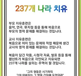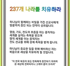 치유 썸네일형 리스트형 237개 나라를 치유하라(마 24:1~14) - 조은친구 #기도수첩 2018년 8월 3일 금요일 237개 나라를 치유하라(마 24:1~14) 이 천국 복음이 모든 민족에게 증언되기 위하여 온 세상에 전파되리니 그제야 끝이 오리라(14) ♬ 정시예배를 위한 찬송 / 510장 하나님의 진리등대(구 276장) [문서 보기] http://www.evernote.com/l/AXQj_Ox0FklDgK2JLQjU5K3qNPaHf6HkOWE/ [동영상 보기] https://youtu.be/LBLJrKIGeIk 우리는 237개 나라를 살리라는 사명을 받았지만, 능력도 없고 잘 안 된다며 오해하고 있습니다. 세상에는 크고 힘 있는 자가 많지만 그들이 세계복음화를 이룬 적은 없습니다. 그래서 하나님이 우리에게 준비하신 응답이 있습니다. 그리스도를 체험할 때 오는 100년의 응답,.. 더보기 아무도 모르는 지구상의 문제 - Remnant 치유-기도수첩 #기도수첩 2018년 7월 2일 월요일 아무도 모르는 지구상의 문제 - Remnant 치유(창세기 37:1~11) 그가 그의 꿈을 아버지와 형들에게 말하매 아버지가 그를 꾸짖고 그에게 이르되 네가 꾼 꿈이 무엇이냐 나와 네 어머니와 네 형들이 참으로 가서 땅에 엎드려 네게 절하겠느냐 그의 형들은 시기하되 그의 아버지는 그 말을 간직해 두었더라(10~11) ♬ 정시예배를 위한 찬송 / 490장 주여 지난밤 내 꿈에(구 542장) [문서 보기] http://www.evernote.com/l/AXT9Q_UHUKVEMJ3MOu44WWap-PYYM924Zwk/ [동영상 보기] https://youtu.be/48bNCEtbN_8 모든 사람은 태어날 때부터 영적 문제를 가지고 있습니다. Remnant의 시기에는 이 .. 더보기 병든가문,시대, 국가,세계를 치유한숨은능력(창세기 39:1~6)-기도수첩 #기도수첩 2018년 6월 29일 금요일 병든 가문, 시대, 국가, 세계를 치유한 숨은 능력(창세기 39:1~6) 요셉이 이끌려 애굽에 내려가매 바로의 신하 친위대장 애굽 사람 보디발이 그를 그리로 데려간 이스마엘 사람의 손에서 요셉을 사니라 여호와께서 요셉과 함께 하시므로 그가 형통한 자가 되어 그의 주인 애굽 사람의 집에 있으니 그의 주인이 여호와께서 그와 함께 하심을 보며 또 여호와께서 그의 범사에 형통하게 하심을 보았더라(1~3) ♬ 정시예배를 위한 찬송 / 325장 예수가 함께 계시니(구 359장) [문서 보기] http://www.evernote.com/l/AXS2B152RmZL85vyo0VEVTcolfHfYLyd7OY/ [동영상 보기] https://youtu.be/e-LGbxr479Y 복음.. 더보기 237개 나라 – 치유(창세기 37:1~11) - 기도수첩 #기도수첩 2018년 6월 27일 수요일 237개 나라 – 치유(창세기 37:1~11) 요셉이 다시 꿈을 꾸고 그의 형들에게 말하여 이르되 내가 또 꿈을 꾼즉 해와 달과 열한 별이 내게 절하더이다 하니라 그가 그의 꿈을 아버지와 형들에게 말하매 아버지가 그를 꾸짖고 그에게 이르되 네가 꾼 꿈이 무엇이냐 나와 네 어머니와 네 형들이 참으로 가서 땅에 엎드려 네게 절하겠느냐 그의 형들은 시기하되 그의 아버지는 그 말을 간직해 두었더라(9~11) ♬ 정시예배를 위한 찬송 / 310장 아 하나님의 은혜로(구 410장) [문서 보기] http://www.evernote.com/l/AXQ38tLPJ_xJ0qvF9qIIt_b4TdWvWK2hJmU/ [동영상 보기] https://youtu.be/acQFzZhGkWw .. 더보기 이전 1 ··· 24 25 26 27 28 29 30 ··· 32 다음